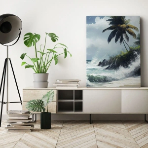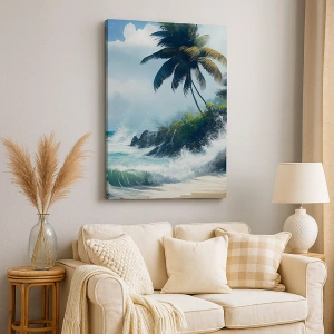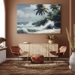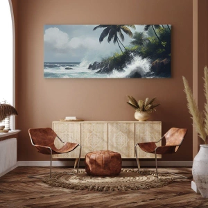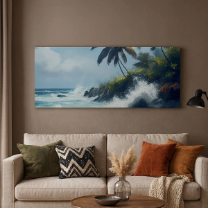 • Une peinture sur toile représentant un rivage tropical avec des palmiers et une mer agitée, introduisant une atmosphère exotique et la dynamique de la nature à l'intérieur.
