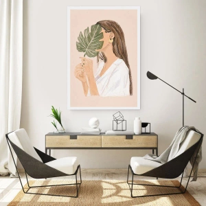 Affiche - Poster - Portrait d'une femme avec une feuille de monstera sur fond beige - 100x70cm - Portrait mystérieux avec un éventail - Décoration murale moderne pour le salon et la chambre ARTTOR