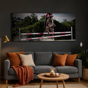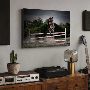 Impression sur toile - Image sur toile - Un cavalier sur un cheval sautant par-dessus un obstacle sur une piste de course - 70x50cm - Ensemble pour la victoire - Décoration murale moderne pour le salon et la chambre ARTTOR
