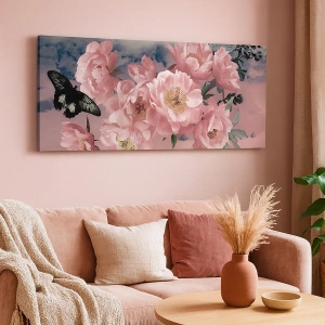 - Ce tableau représente des pivoines roses entourées de feuilles délicates, avec un papillon noir sur un fond aux tons pastel délicats. Parfait pour les intérieurs romantiques ou classiques, il apporte harmonie et élégance à tous les espaces.