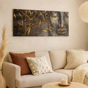 - Ce tableau représente une image du Bouddha entourée de bambous dorés sur un fond sombre. Il s'intègre parfaitement à l'atmosphère zen et spirituelle, apportant harmonie et paix aux intérieurs.