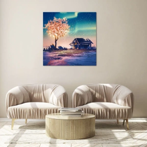 Impression sur verre - Image sur verre - Un paysage magique avec un arbre en fleurs et un chalet - 50x70cm - La nature ne passe pas - Décoration murale moderne pour le salon et la chambre ARTTOR