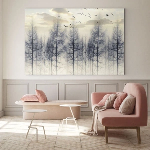 Impression sur verre - Image sur verre - Une forêt brumeuse avec des oiseaux, illuminée par le soleil levant - 70x50cm - L'âme de la forêt - Décoration murale moderne pour le salon et la chambre ARTTOR