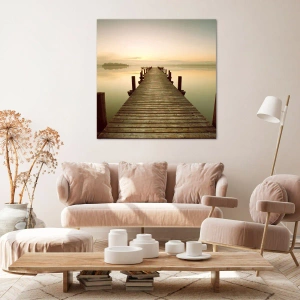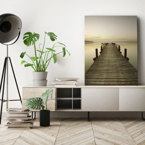 - Une impression sur toile représentant une jetée en bois sur un lac calme le matin, parfaite pour les intérieurs propices à la détente et à la tranquillité.