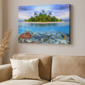 Impression sur toile - Image sur toile - Une île tropicale entourée d'un océan turquoise avec un récif de corail et des poissons. - 50x70cm - L'île céleste vous invite - Décoration murale moderne pour le salon et la chambre ARTTOR
