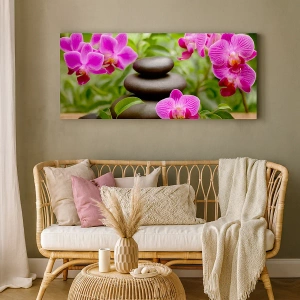 Impression sur toile - Image sur toile - Orchidées roses avec des pierres sur fond vert - 50x70cm - Pyramide de la Paix - Décoration murale moderne pour le salon et la chambre ARTTOR