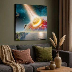 Impression sur toile - Image sur toile - Une météorite entre en collision avec une planète dans un paysage cosmique. - 100x70cm - Drame spatial - Décoration murale moderne pour le salon et la chambre ARTTOR