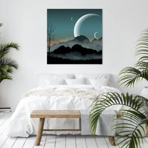 La toile « Montagnes brumeuses avec lune » est un ajout intérieur unique qui attire l'attention par son atmosphère extraordinaire. Elle représente des sommets montagneux brumeux au crépuscule, sur lesquels un arbre solitaire émerge, soulignant la beauté de la nature dans une forme subtile et minimaliste. Une lune caractéristique, accompagnée d'étoiles, plane au-dessus du paysage, créant une atmosphère de paix et de tranquillité.