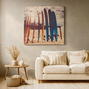 Impression sur toile - Image sur toile - Planches de surf sur la plage au coucher du soleil - 120x80cm - Bonne nuit, à demain - Décoration murale moderne pour le salon et la chambre ARTTOR