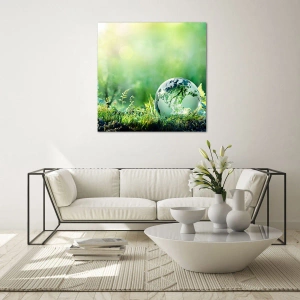 Impression sur verre - Image sur verre - Une boule de verre avec une carte du monde sur un fond de nature verdoyante - 50x70cm - La planette verte - Décoration murale moderne pour le salon et la chambre ARTTOR