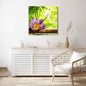 - Cette horloge murale présente un motif de lotus violet sur fond de bambous et de végétation verte. Elle est l'élément décoratif idéal pour les intérieurs harmonieux et zen.