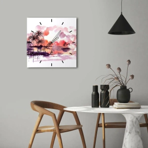 - Cette horloge murale présente un motif de paysage aquarelle représentant des palmiers au coucher du soleil. Les tons chauds de rose et de violet créent une composition harmonieuse, parfaite pour les intérieurs élégants.