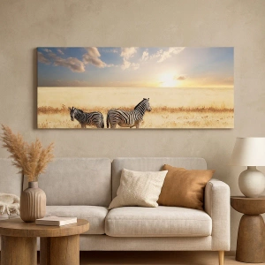 Impression sur toile - Image sur toile - Deux zèbres dans la savane sous les rayons du soleil couchant - 50x70cm - Va-t'en, n'ai pas de paix - Décoration murale moderne pour le salon et la chambre ARTTOR
