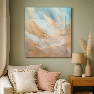 Impression sur toile - Image sur toile - Plumes délicates dans des tons pastel de bleu et d'orange - 50x70cm - Au pays de la douceur - Décoration murale moderne pour le salon et la chambre ARTTOR