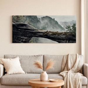 Impression sur toile - Image sur toile - Une arche de pierre entourée de montagnes brumeuses et de forêts - 50x70cm - L'aventure est sur le point de commencer - Décoration murale moderne pour le salon et la chambre ARTTOR