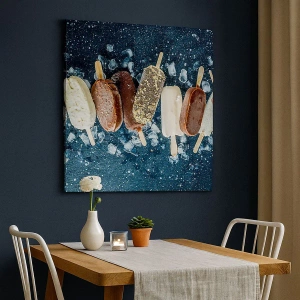 • Ce tableau représente des glaces colorées disposées sur des glaçons, le tout sur un fond sombre. C'est la décoration idéale pour les amoureux de l'été et les gourmands, idéale pour les cuisines, les cafés ou les intérieurs modernes.