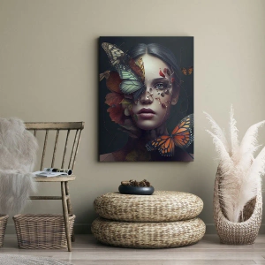 - Un portrait artistique de femme, agrémenté de papillons et d'éléments floraux. Ce tableau se distingue par son style unique et son harmonie, ce qui en fait un ajout idéal à un salon ou une chambre.