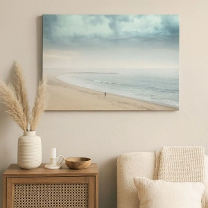 - Un tableau représentant une silhouette solitaire sur une plage déserte, baignée par une mer calme. Ce paysage minimaliste et apaisant apporte harmonie et élégance aux intérieurs, le complétant parfaitement aux espaces au caractère subtil.