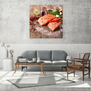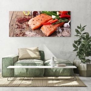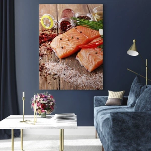 - Le tableau représente des filets de saumon aux épices et aux herbes fraîches sur un plan de travail en bois rustique. Les tons chauds du décor en font un décor idéal pour une cuisine.