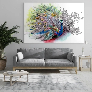 Impression sur verre - Image sur verre - Paon coloré dans un style aquarelle artistique - 70x50cm - Avec fierté contre la grisaille - Décoration murale moderne pour le salon et la chambre ARTTOR