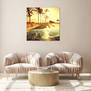 - Une plage dorée bordée de palmiers au coucher du soleil, créant une atmosphère de détente et d'exotisme. Un tableau sur verre parfait pour égayer n'importe quel intérieur.