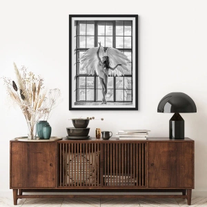 L'affiche en noir et blanc représente une femme avec des ailes d'ange devant une grande fenêtre. Son design élégant et subtil en fait une décoration parfaite pour un salon, une chambre ou un espace artistique.