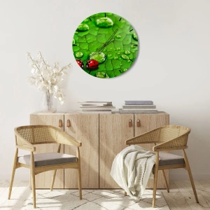 Horloge murale - Rencontre en vert - Coccinelles sur une feuille avec gouttes d'eau
