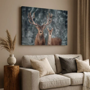 Impression sur toile - Image sur toile - Cerf dans une forêt d'hiver enneigée - 50x70cm - Le roi de la forêt avec sa femme - Décoration murale moderne pour le salon et la chambre ARTTOR
