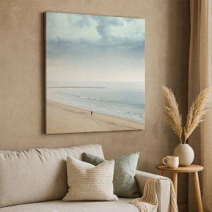 - Un tableau représentant une silhouette solitaire sur une plage déserte, baignée par une mer calme. Ce paysage minimaliste et apaisant apporte harmonie et élégance aux intérieurs, le complétant parfaitement aux espaces au caractère subtil.