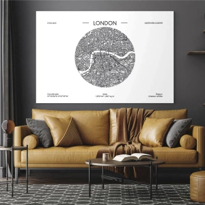 Impression sur verre - Image sur verre - Une carte détaillée de Londres dans un style graphique noir et blanc. - 70x50cm - Anatomie de Londres - Décoration murale moderne pour le salon et la chambre ARTTOR