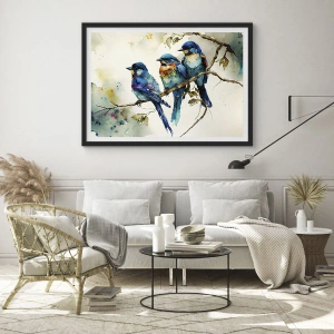 Affiche dans un cadre noir - Poster - Oiseaux à l'aquarelle sur une branche dans les tons de bleu et de marron - 50x70cm - A-t-il été offensé ? - Décoration murale moderne pour le salon et la chambre ARTTOR