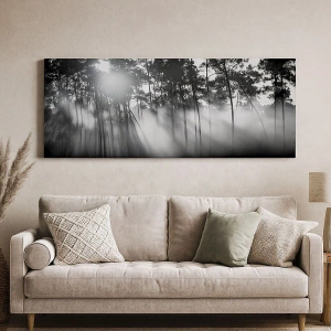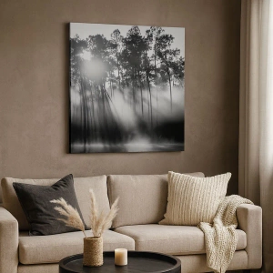 La composition du tableau s'inspire d'éléments naturels, tels que des arbres élancés et une brume délicate, créant une ambiance mystérieuse et élégante. Les couleurs monochromes soulignent le minimalisme et l'universalité, faisant de ce tableau un excellent choix pour les intérieurs modernes.