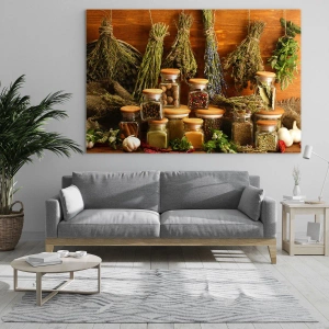 L'impression « Herbes et épices en pots sur fond bois » crée une atmosphère naturelle et rustique. L'élément central de la composition est constitué de pots remplis d'épices diverses, posés sur une surface en bois. Des bouquets d'herbes séchées sont visibles en arrière-plan, ce qui confère à l'ensemble un caractère authentique.