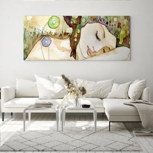 Impression sur verre - Image sur verre - Une femme endormie dans une aquarelle artistique aux couleurs chaudes. - 50x70cm - Un rêve violet émeraude - Décoration murale moderne pour le salon et la chambre ARTTOR