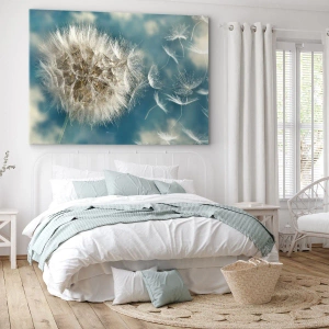 - Le tableau « Souffle d'ange » représente un pissenlit emporté par le vent dans un ciel bleu. Une composition subtile et inspirante, pleine de délicatesse et d'harmonie.