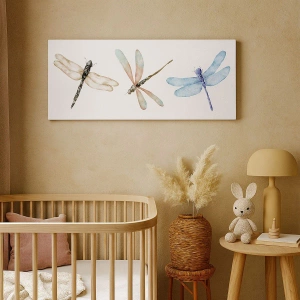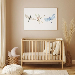 - Trois libellules peintes aux couleurs pastel sur fond blanc. Chaque libellule se distingue par ses ailes aux couleurs uniques : rose, bleu et crème. Un motif naturel délicat qui apporte une touche de légèreté à tout intérieur.