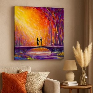 Le Ciel les aime aussi est une impression sur toile unique représentant une scène romantique d'un couple debout sur un pont au cœur d'une forêt d'automne. Des tons chauds d'orange, de jaune et de rouge contrastent avec des violets et des bleus plus froids, créant une composition pleine d'harmonie et d'émotion. Les rayons de lumière traversant les arbres ajoutent de la profondeur et un caractère pittoresque à l'image.