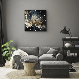 Horloge murale - Pendule murale - Une fleur dans les tons or et bleu marine sur fond noir - 30x30cm - Fleur de fougère de conte de fées - Décoration murale moderne pour le salon et la chambre ARTTOR