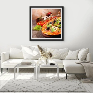 - Cette affiche présente une délicieuse pizza aux olives, aux herbes et au fromage, entourée d'ingrédients frais sur un fond rustique. Idéale pour décorer votre cuisine ou votre salle à manger, elle est livrée avec un cadre noir de 50 x 70 cm.