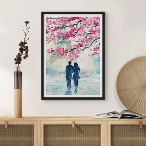 - L'affiche représente un couple romantique se promenant sous des branches fleuries. La subtile palette de couleurs pastel et le style artistique de l'image créent une atmosphère unique. Le cadre noir rehausse l'élégance de l'image.