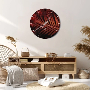 - Horloge ronde en verre de 30x30 cm avec une représentation artistique de feuilles rouge-orange d'une plante tropicale sur un fond sombre, parfaite pour les intérieurs au caractère exotique.