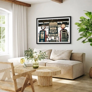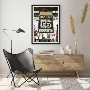 - Cette affiche représente un panneau de la Route 66 sur fond de station-service. C'est l'objet décoratif idéal pour les passionnés de voyages et de style vintage. Elle mesure 50 x 70 cm et est présentée dans un élégant cadre noir.