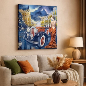La toile « Femme en robe élégante près d'une voiture rétro la nuit » allie style classique et expression artistique. La femme en robe de soirée respire l'élégance, tandis que la voiture rétro en arrière-plan souligne l'atmosphère d'antan. La ville nocturne illuminée par les lampadaires ajoute une atmosphère et un mystère à l'ensemble, créant une composition harmonieuse et esthétique.