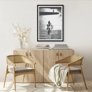 Affiche dans un cadre noir - Poster - Silhouette noire et blanche d'un cycliste sur une rue mouillée - 70x50cm - Devant moi, à travers la ville - Décoration murale moderne pour le salon et la chambre ARTTOR