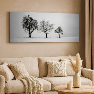 Impression sur toile - Image sur toile - Trois arbres dans un champ enneigé dans un style monochrome - 80x120cm - A quoi rêvent-ils? - Décoration murale moderne pour le salon et la chambre ARTTOR