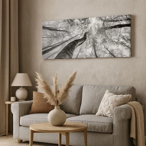 Impression sur toile - Image sur toile - Perspective d'arbres dans une forêt vue d'en bas en nuances de gris - 120x50cm - Course vers la lumière - Décoration murale moderne pour le salon et la chambre ARTTOR