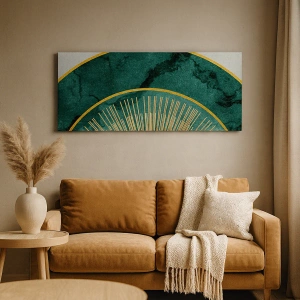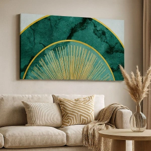 - Une impression sur toile présentant un motif abstrait avec des cercles émeraude et or, parfaite pour les intérieurs modernes qui nécessitent des accents élégants.