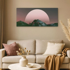 « Dans une galaxie voisine » est une peinture sur toile exceptionnellement moderne qui se distingue par son originalité. Elle représente des montagnes géométriques, enveloppées dans la lumière délicate du soleil couchant. La palette de couleurs rose et verte lui confère un caractère unique.