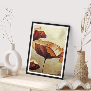 Le point central du tableau sont les délicats pétales de coquelicots, rendus avec une précision et un souci du détail extraordinaires. Les tons chauds de brun, de rouge et de beige donnent de la profondeur au tableau et créent une atmosphère chaleureuse. Cette affiche n'est pas seulement une décoration, mais aussi une expression d'amour pour la nature et la beauté en toute simplicité.