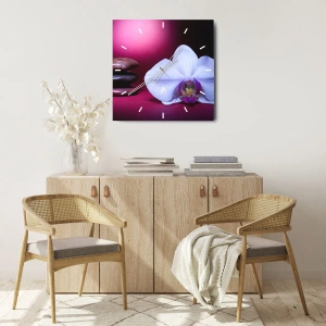 Horloge murale - Étude de fraîcheur en violet - Orchidée blanche sur fond de pierres et de violet